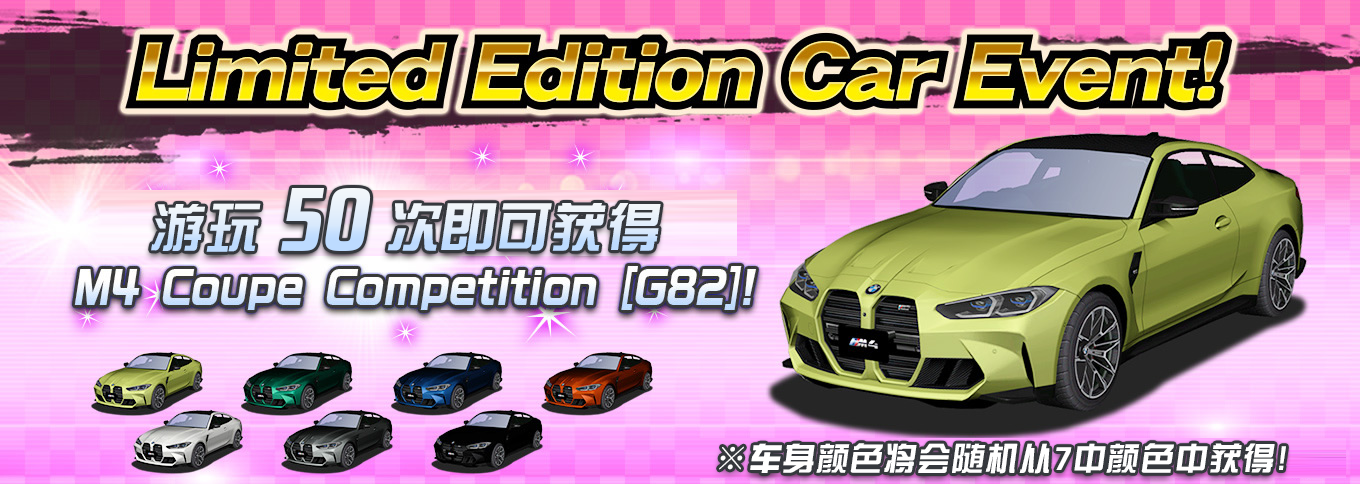 | 活动内容 | - 活动期间在任意模式游玩50次 就可以获得一辆 M4 Coupe Competition. *获得车辆的初始颜色为7种颜色中随机. 已经获得的颜色不会重复发放。 *距获得物品剩余的游玩次数在结算公里数界面展示。 *获得的物品领取有效期为30天,逾期无法领取。 |